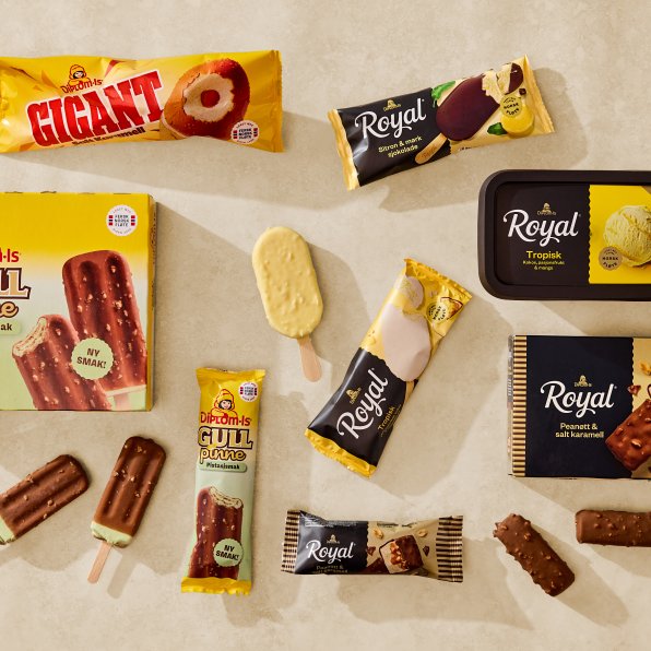Royal-serien vokser, og årets nyheter byr på ekstra mye smak, glede og litt uventet luksus i hver bit. Serien utvides blant annet med Royal Peanøtt og salt karamell, en iskrembar med premium vaniljeis toppet med salt karamell og røstede peanøtter, dekket av et fyldig trekk av melkesjokolade.